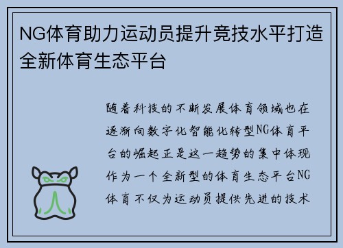 随着科技的不断发展,体育领域也在逐渐向数字化、智能化转型,NG体育平台的崛起正是这一趋势的集中体现。作为一个全新型的体育生态平台,NG体育不仅为运动员提供先进的技术支持,还通过创新的方式帮助运动员全面提升竞技水平。这篇文章将从四个方面详细阐述NG体育如何通过智能科技、个性化训练、专业数据分析和全方位赛事支持,助力运动员提升竞技水平,打造一个全新的体育生态平台。本文将逐步分析这些内容,探讨NG体育如何在运动员的发展过程中发挥重要作用,并为体育行业的发展带来深远影响。